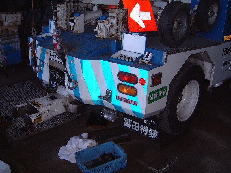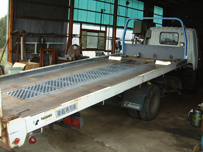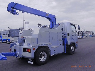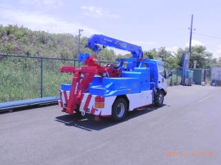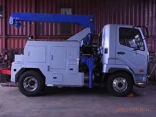 3.5tベースのトラックに、4段ブームのラジコン装備のタダノクレーン、またセンチュリー211のワンウインチをダブルウインチに改造、リフトもウインチもラジコン装備、コンプレッサー積載後部にはリアバンパー前に独立のアウトリガーを積載して横引きにも対応するレッカーです。