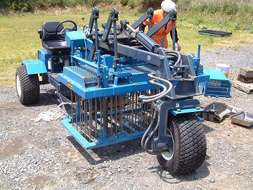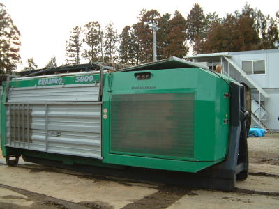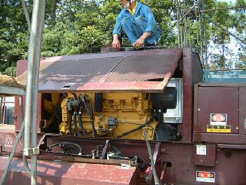 こちらも外国製のウッドチップ製造機です。油圧を動かすのに三菱のエンジンを搭載しトレーラーのキャブにて移動可能のつくりになっています。こちらは振動が強く油圧機関やフレームの割れといった故障が目立ちました。また、外国製の油圧コントロールバルブやその他機関を全て日本製に改造したことにより、メンテナンスがより安く安価な値段でできるようになりました。